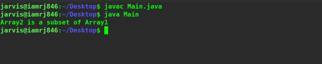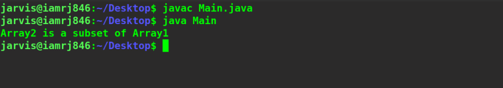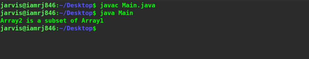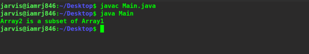 import java.io.*; import java.util.*; class Main { public static void main (String[] args) { int len1,len2,s,i; int array1[] = {10,8,5,61,6,0}; int array2[] = {8,6,0,5}; len1=array1.length; len2=array2.length; Set <Integer> s1 = new HashSet(); for ( i = 0; i < len1; i++) { s1.add(array1[i]); } s = s1.size(); for ( i = 0; i < len2; i++) { s1.add(array2[i]); } if (s1.size() == s) System.out.println("Array2 is a subset of Array1"); else System.out.println("Array2 is not a subset of Array1" ); } }
