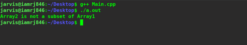 #include <bits/stdc++.h> using namespace std; int main() { int len1,len2,i; int array1[] = { 10,8,5,61,6,0 }; int array2[] = {8,6,0,5 }; len1 = sizeof(array1) / sizeof(array1[0]); len2 = sizeof(array2) / sizeof(array2[0]); unordered_set <int> s1; for (i = 0; i < len1; i++) { s1.insert(array1[i]); } int p = s1.size(); for (i = 0; i < len2; i++) { s1.insert(array2[i]); } if (s1.size() == p) { cout << "Array2 is a subset of Array1"<< "\n"; } else { cout << "Array2 is not a subset of Array1 "<< "\n"; } }