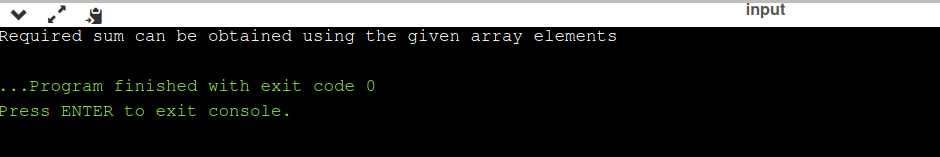 using System; class Program { static bool arraychecker(int[] arr,int array_size, int sum) { int beg, end; // Sorting array elements sort(arr, 0, array_size - 1); beg = 0; end = array_size - 1; while (beg < end) { if (arr[beg] + arr[end] == sum) return true; else if (arr[beg] + arr[end] < sum) beg++; else end--; } return false; } static int fun1(int[] arr, int low, int high) { int i,j,t,pivot,t1; pivot = arr[high]; i = (low - 1); for(j = low; j <= high - 1; j++) { if (arr[j] <= pivot) { i++; t = arr[i]; arr[i] = arr[j]; arr[j] = t; } } t1 = arr[i + 1]; arr[i + 1] = arr[high]; arr[high] = t1; return i + 1; } static void sort(int[] arr, int low, int high) { if (low < high) { int pi = fun1(arr, low, high); sort(arr, low, pi - 1); sort(arr, pi + 1, high); //Sorting elements in recursive manner } } // Driver code public static void Main() { int[] arr = { 12,28,7,6 }; int sum = 18; int array_size = 4; if (arraychecker(arr, array_size, sum)) Console.Write("Required sum can be obtained using the given array elements"); else Console.Write("Required sum cannot be obtained using the given array elements"); } }