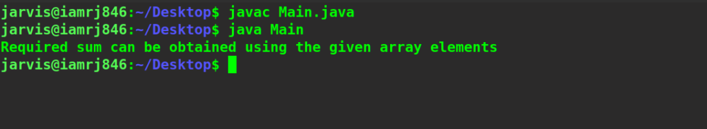 import java.util.*; class Main { static boolean arraychecker(int arr[],int array_size, int sum) { int beg, end; // Sort the array in increasing order Arrays.sort(arr); beg = 0; end = array_size - 1; while (beg<end) { if (arr[beg] + arr[end] == sum) return true; else if (arr[beg] + arr[end] < sum) beg++; else end--; } return false; } // Driver Code public static void main(String args[]) { int arr[] = { 12,28,7,6 }; int sum = 18; int array_size = arr.length; // calling arraychecker function if (arraychecker(arr, array_size, sum)) System.out.println("Required sum can be obtained using the given array elements"); else System.out.println("Required sum cannot be obtained using the given array elements"); } }