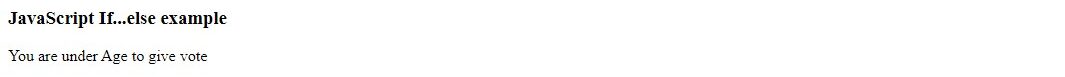<!DOCTYPE html> <html> <head> <title></title> <script> document.write("<h3> JavaScript If...else example</h3>"); let age = 17; if (age>=18) //false { document.write("You are eligible to vote"); } else { document.write("You are under Age to give vote") } </script> <body> </body> </html>