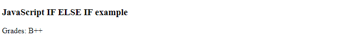 <!DOCTYPE html> <html> <head> <title></title> <script> document.write("<h3> JavaScript IF ELSE IF example</h3>"); let marks =89; let grade; if(marks==100) { grade= "A++"; } else if(marks >= 90 && marks <=99) { grade ="A"; } else if(marks >=80 && marks <=89) { grade="B++"; } else if (marks>=70 && marks<=79) { grade="B"; } else { grade ="C" } document.write("Grades: "+ grade); </script> <body> </body> </html>Output