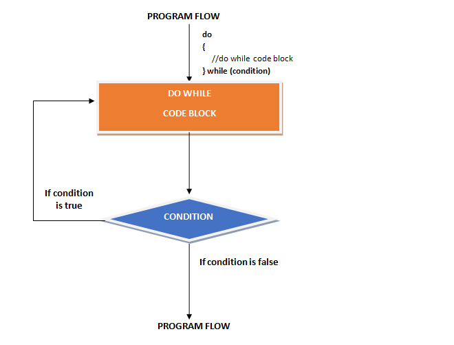do { //do while code block }while(condition)From the above syntax and flow chart, you can see that the code block is before the while condition. This means the the JavaScript interpreter will execute the code first then go for the condition check, because of the top to bottom approach.
