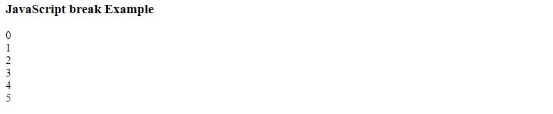 <!DOCTYPE html> <html> <head> <title></title> <script> document.write("<h3> JavaScript break Example</h3>"); for(let i =0; i <10; i++) { document.write(i); document.write("<br>"); if(i==5) { break; //terminate the loop } } </script> <body> </body> </html>