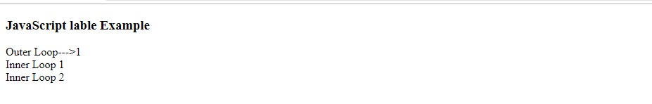 <!DOCTYPE html> <html> <head> <title></title> <script> document.write("<h3> JavaScript lable Example</h3>"); OuterLoop: for(let i =1; i <=10; i++) { document.write("Outer Loop--->"+i); document.write("<br>"); for(let j=1; j <= 5; j++) { if(j==3) { break OuterLoop; //terminate the i for loop } document.write("Inner Loop "+j); document.write("<br>"); } } </script> <body> </body> </html>