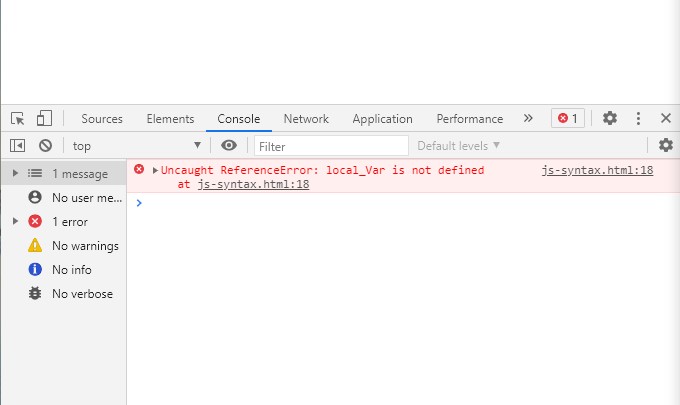 <script> function func1() { var local_Var = "Func1 local variable"; } function func2() { var local_Var ="Func2 local variable"; } func1(); // call func1 document.write(local_Var); // error func2(); document.write(local_Var); //error </script>