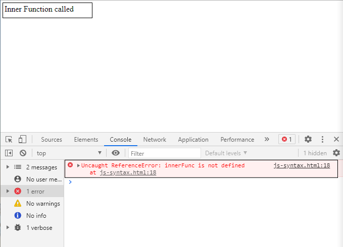 <script> function outerFunc() { function innerFunc() { document.write("Inner Function called"); } innerFunc(); // call innerFunc } outerFunc(); //call outerFunc innerFunc(); // error </script>