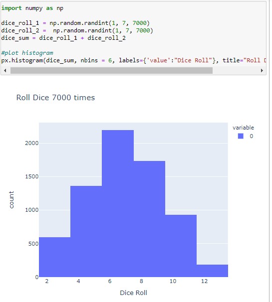 Histogram plots are similar looking to the bar plots, but the histogram is used to visualize the data distribution. With the histogram, we can easily estimate the major surge of values. For the example below, we will create two random arrays of 7000 values representing dice numbers between 1 to 6 and sum them. And with a histogram, we will see which number is occurred most of the time. To plot a Histogram in Plotly, we use the Plotly