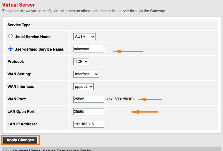 Step 4: Minecraft server works on 25565 port number. We need to open this port for the Minecraft server on the router. First, name your rule by clicking on “User-defined Service Name” and name this rule Minecraft. In the LAN IP address, mention the local IP address of the Minecraft server. In LAN Open Port, mention 25565. In the WAN port, mention 25565. Finally, click on Apply Changes.