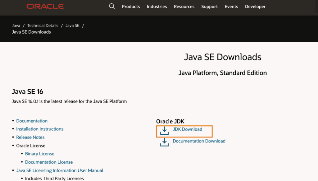 Step 1: Download JDK from the following page. Click on Download JDK 16 or newer to start downloading: