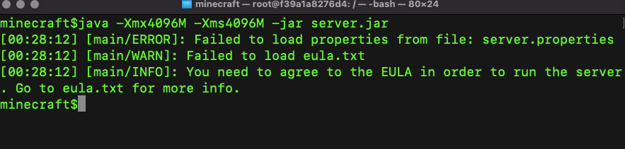 Step 3: The first time you run the Minecraft server, you will notice the following error: Do not worry, this is usual. In the next step, we’ll show you how to resolve this.