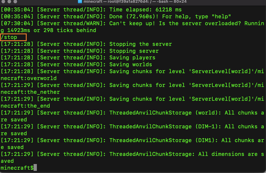 Open the command prompt/terminal of your Minecraft server, and type “/stop” to stop your Minecraft server.