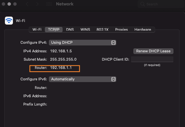 In Network, click on TCP/IP, and here you will find your Default Gateway IP address as Router: