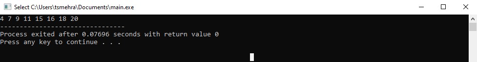 #include <iostream> using namespace std; // function to move zeros //at the end of the array void sort_swap(int arr[],int n) { // represent the index value of two swapped elements int ptr1=-1, ptr2=-1, temp; //count for the 1st and 2nd conflicting elemetns int count=0; //initial previous values int prev = arr[0]; //start the loop from 2nd element for(int i=1; i<n; i++) { // check for conflict // if the current element is smaller // than previous element if(arr[i]<prev) { if(count ==0) { //first conflict element ptr1= i-1; ptr2= i; //if both the conflicting elements are adjacent count++; } else if (count==1) { // second conflict element ptr2=i; } } //update previous value prev = arr[i]; } //swap the conflicted elements temp = arr[ptr1]; arr[ptr1] = arr[ptr2]; arr[ptr2] = temp; } int main() { //given array int arr[]={4, 7, 9, 18, 15, 16, 11, 20}; //length of the array int n = sizeof(arr) / sizeof(arr[0]); sort_swap(arr, n); for(int i=0; i<n;i++) { cout<<arr[i]<<" "; } return 0; }