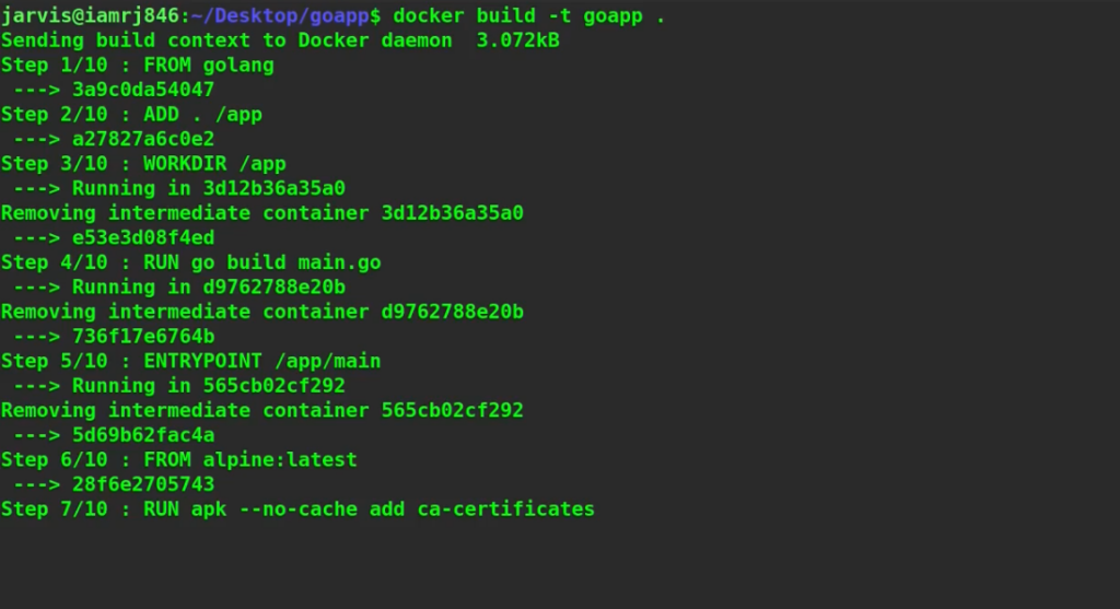 Here, we have not used any multistage build. We have simply pulled the golang base image from the Docker registry, copied the build context and set the working directory, used the RUN instruction to build the application, and create a binary file. And then, using the ENTRYPOINT instruction, we have instructed the daemon to execute the binary when we run the container. Let’s try to build this image.