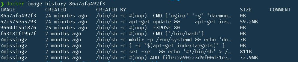 - /bin/sh -c apt-get update && apt-get instal nginx -y && apt-get clean && rm -rf /var/lib/apt/lists/* was the third instruction in our Dockerfile and this instruction created the layer with ID 62c575ea5393. Provided that all required packages were installed during the execution of this instruction, this image layer has a size of 60MB.