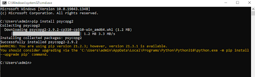 Note: To use sqlalchemy one of the above libraries also needs to be installed. This tutorial will only be sticking to the Psycopg2 library because it is the most popular and stable Python library to connect with the PostgreSQL database. psycopg2 also has a binary stand-along package that needs no compiler or external libraries to execute. With the following pip install, you can also download its binary version using the pip command only.