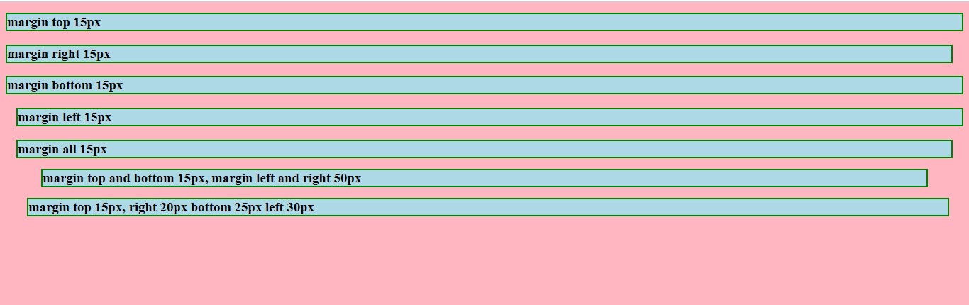 <!DOCTYPE html> <html> <head> <style> body{ background-color:lightpink; } h3{ border:2px solid green; background-color:lightblue; } .a{margin-top:15px;} .b{margin-right:15px; } .c{margin-bottom:15px;} .d{margin-left:15px;} .e{margin: 15px} .f{margin: 15px 50px} .g{margin: 15px 20px 25px 30px} </style> </head> <body> <h3 class="a">margin top 15px</h1> <h3 class="b">margin right 15px</h1> <h3 class="c">margin bottom 15px</h1> <h3 class="d">margin left 15px</h1> <h3 class="e">margin all 15px</h1> <h3 class="f">margin top and bottom 15px, margin left and right 50px</h1> <h3 class="g">margin top 15px, right 20px bottom 25px left 30px</h1> </body> </html>