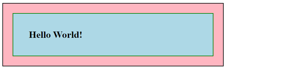 <!DOCTYPE html> <html> <head> <style> div{ border:2px solid black; background-color: lightpink; } h1{ border:2px solid green; background-color:lightblue; /* Padding 52px from all side top right bottom and left */ padding: 52px; /*margin 32 px*/ margin:32px; } </style> </head> <body> <div> <h1>Hello World!</h1> </div> </body> </html>