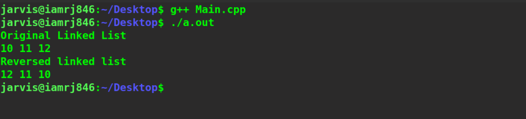 //Importing all the required libraries #include #include #include<bits/stdc++.h> using namespace std; //Creating structure for the node of linked list struct Node{ int data;//data to be stored to the node in the linked list Node*next;//next reference to the node in the linked list //Creating Constructor Node(int data){ this->data=data; //Storing the data to the node this->next=nullptr; } }; //Function to Transverse the Linked list void print(Node *head){ //Checking if the Linked list is null or not Node *temp=head; if(temp==NULL){ return; } //Transverse the Linked List while(temp!=NULL){ cout<data<<" "; temp=temp->next; } } //Function reverse the linked list Node *reverse_LinkedList(Node *head){ //Checking the base condition if(head->next==NULL||head==NULL){ return head; } //Recursively call the remaining node of the linked list Node* remaining=reverse_LinkedList(head->next); //Update the reference of the head pointer head->next->next=head; head->next=NULL; return remaining; } int main(){ //Creating Head of the linked list Node *head =new Node(10); //Creating Second node of the linked list head->next=new Node(11); //Creating third node of the linked list head->next->next=new Node(12); //Printing Original Linked List printf("Original Linked List\n"); print(head); printf("\n"); //Printing Reversed Linked List printf("Reversed linked list\n"); Node * head1=reverse_LinkedList(head); print(head1); return 0; }
