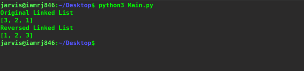 #Creating Node class class Node: #Creating Constructor def __init__(self,data): self.data=data #Creating data to be stored in the node of the linked list self.next=None #Creating next reference of the node #Creating class of Linked class class LinkedList: #Creating Constructor def __init__(self): self.head=None #Funcion to insert new node in the linked list def insert(self,data): #Checking if head is not None if self.head is None: self.head=Node(data) else: last=self.head while(last.next): last=last.next #Insert last node in the linked list last.next=Node(data) #Function to print the Linked list def print(self): #Creating temp reference of the head temp=self.head LinkedList=[] #Iterate the Linked list while(temp is not None): #Storting the node data in the list LinkedList.append(temp.data) temp=temp.next #Printing the list print(LinkedList) #Function to reverse the Linked list def reverse(self): #Creating two reference current=self.head #First reference previous=None #Second reference previous_previous=None while(current is not None): #Store the current.next reference previous=current.next #Initialize the current.next last previous node current.next=previous_previous #Update the last previous node current element previous_previous=current current=previous self.head=previous_previous list=LinkedList() #Inserting First Node in the Linked List list.insert(1) #Inserting Second Node in the Linked List list.insert(2) #Inserting Third Node in the Linked List list.insert(3) print("Original Linked List") list.print() list.reverse() #Printing Reversed Linked List print("Reversed Linked List") list.print()